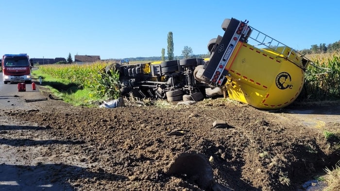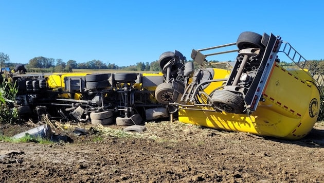 Spektakulärer Abflug eines Schwerfahrzeugs in der Südoststeiermark: Ein Lenker verlor am Freitag in St. Peter am Ottersbach die Kontrolle über seinen Futtermittel-Lkw mit Anhänger, der seitlich in einem Maisacker zu liegen kam.