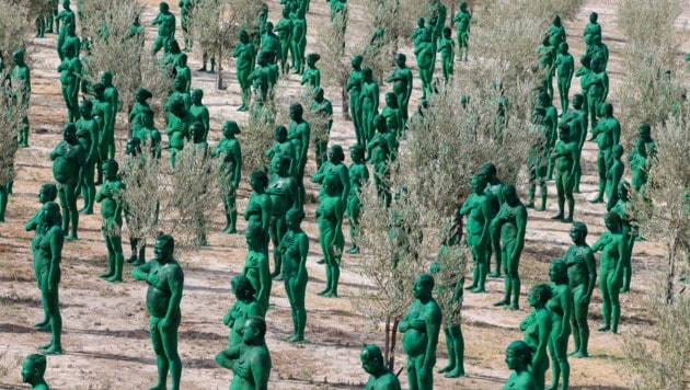 Hunderte Menschen haben sich in Südspanien ausgezogen, dunkelgrün anmalen und vom US-Fotografen Spencer Tunick ablichten lassen. Die Kunstaktion „Porträt Alhambra 1925“ in einem Olivenhain am Stadtrand von Granada war die erste Installation des Fotokünstlers in Andalusien.