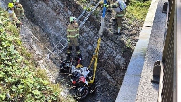 Spektakulärer Motorradunfall am Sonntagvormittag in Achenkirch in Tirol! Ein Motorradfahrer (26) kam von der Fahrbahn ab und stürzte in einen Bach. Der Mann musste von der Feuerwehr mit einer Drehleiter geborgen und schließlich ins Spital geflogen werden.
