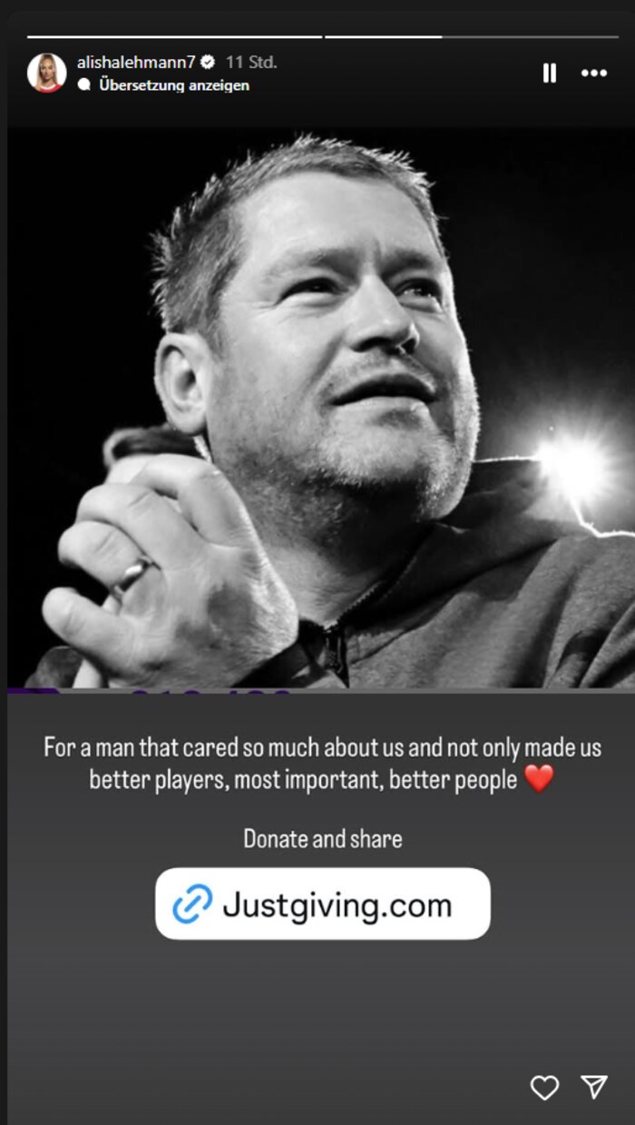Profi-Fußballerin Alisha Lehmann hat sich in mehreren emotionalen Nachrichten auf Instagram von ihrem ehemaligen Trainer und Mentor Matt Beard verabschiedet. Der 47-Jährige ist vor Kurzem überraschend verstorben, wie sein ehemaliger Klub Liverpool mitteilte. Bei Lehmann löste die Nachricht tiefe Trauer aus.