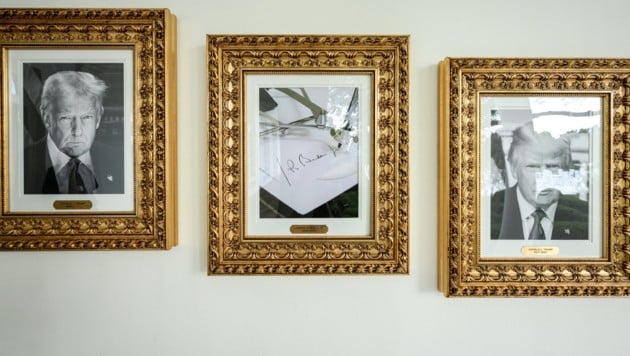 US-Präsident Donald Trump ist bekannt dafür, gegen seinen Vorgänger Joe Biden zu wettern. In einer neuen Galerie, die im Säulengang des Weißen Hauses die US-Staatshäupter zeigt, wurde auf das Konterfei des Demokraten verzichtet – und stattdessen ein Foto eines Unterschriftenautomaten aufgehängt.