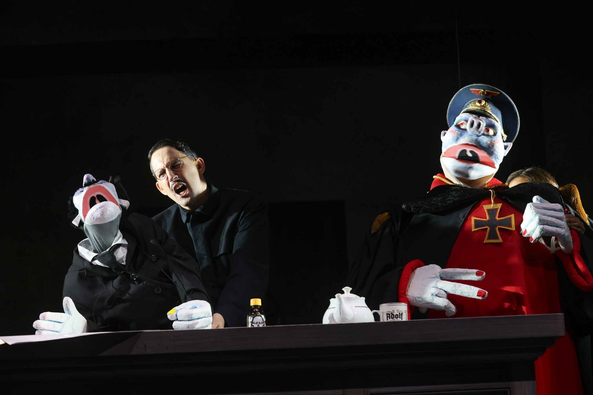 Alle guten Geister Chaplins, Brechts und Taboris haben da zusammengeholfen, das Gebotene ist irrwitzig komisch und verstörend zugleich. Die Fratzen Hitlers, Eva Brauns, Goebbels’ und Görings wecken neben Abscheu fast Erbarmen ob ihrer Jämmerlichkeit. Und wenn sich das totemartige Vogelwesen die sechs Goebbels-Kinder holt, bricht einem das Herz. Zu Zeiten des aufkochenden Antisemitismus unter dem schändlichen Vorwand der Menschenrechtsobsorge ist das die Aufführung der Stunde.