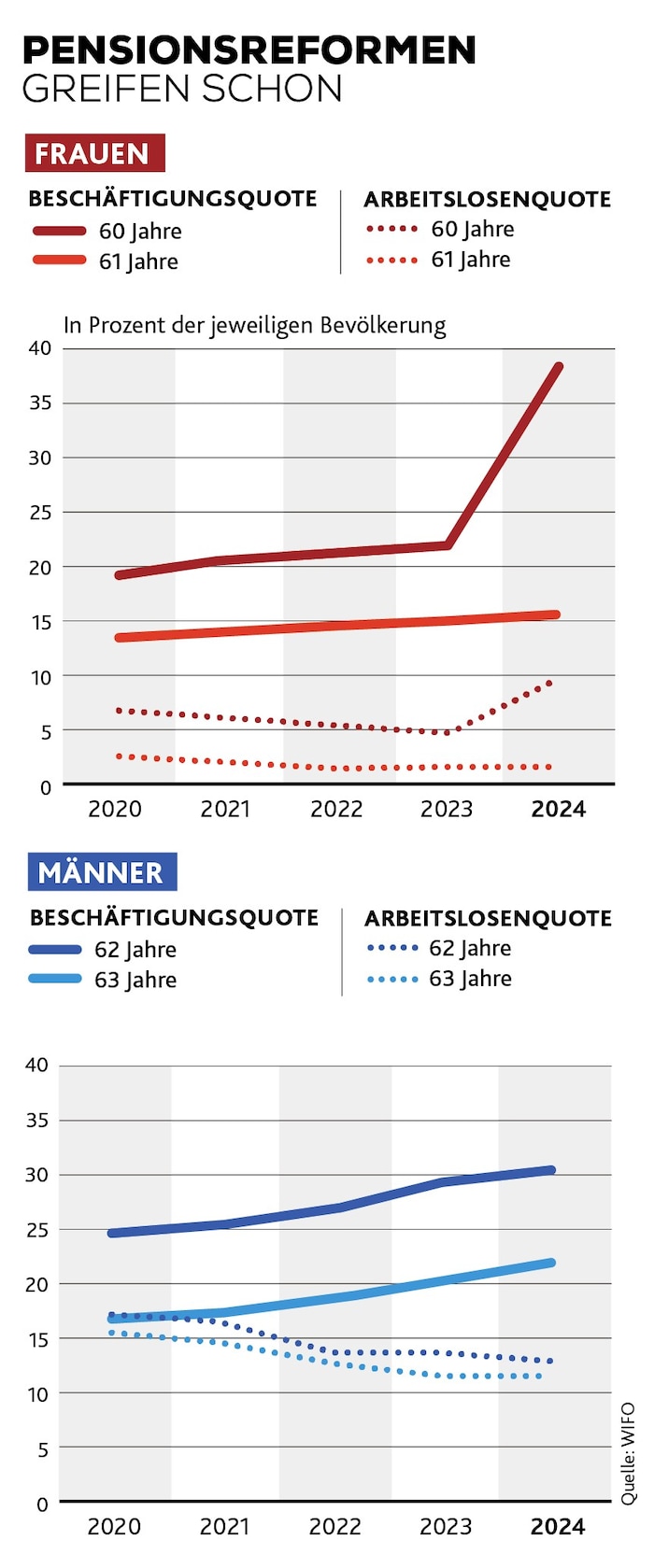 Das Wirtschaftsforschungsinstitut WIFO prognostiziert eine Erhöhung der unselbständigen Beschäftigung der Altersgruppe 60-64 Jahre bis 2030 um 73.500. Diese erfolgt durch die Anhebung des Frauenpensionsalters und die Wirkung anderer bestehender gesetzlicher Maßnahmen. Zur Realisierung der Anhebung des faktischen Pensionsantrittsalters um ein Jahr ist eine Beschäftigungssteigerung dieser Altersgruppe um 115.000 nötig. Daraus ergibt sich eine Lücke von rund 40.000 älteren Personen, die zusätzlich im Erwerbssystem gehalten werden müssten, damit der von der Regierung geplante Pfad eingehalten wird.