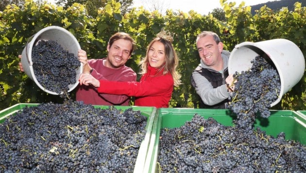 Dem Wein-Burgenland-Obmann zur Seite standen unter anderem Top-Winzer Michael Liegenfeld und dessen Schwester, Weinkönigin Maria. Inmitten der Rebstöcke feierte die Regentin ihren 21. Geburtstag. Mit vereinten Kräften geerntet wurden die Blaufränkisch-Trauben für den gemeinsamen Edeltropfen „Freundschaft“, der fachkundige Genießer stets ins Schwärmen versetzt.