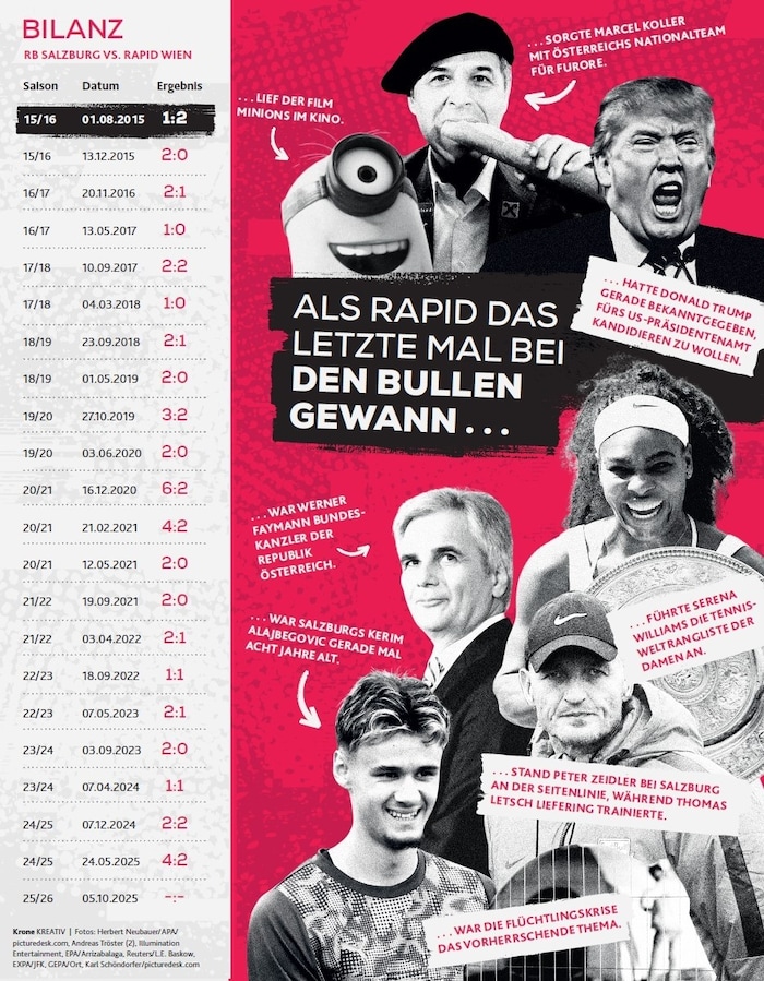 Hätten Sie’s gewusst? Seit mehr als zehn Jahren wartet Rapid auf einen vollen Erfolg in Salzburg. Der bislang letzte grün-weiße Triumph in Wals-Siezenheim ist derart lange her, dass Werner Faymann noch Bundeskanzler der Republik war.
