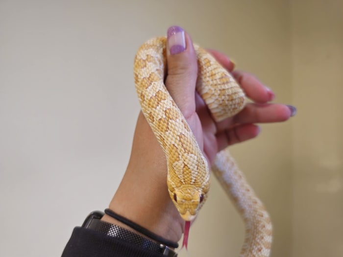 Die männliche Albino-Hakennasennatter Professor Shedworth ist ca. vier Jahre alt und sehr neugierig. Er ist ein gelassener Zeitgenosse, der in ein artgerechtes Zuhause vergeben wird. Er zeigt sich interessiert, lässt sich gerne beobachten und sorgt mit seinem markanten Aussehen für Staunen. Interessenten können sich gerne unter Tel.: 0732/247887 melden.