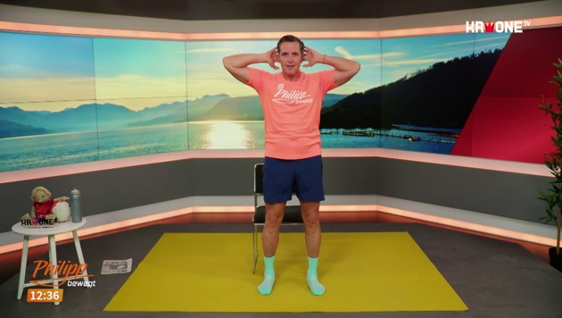 Donnerstag ist Sesseltag, mittlerweile ein alter Klassiker. Philipp zeigt Übungen, die auch im Sitzen funktionieren und viel bringen, dazwischen steht er aber auch gern auf, weil wir sowieso alle zu viel sitzen. Hinter der Kamera wird im Studio übrigens auch mitgeturnt!