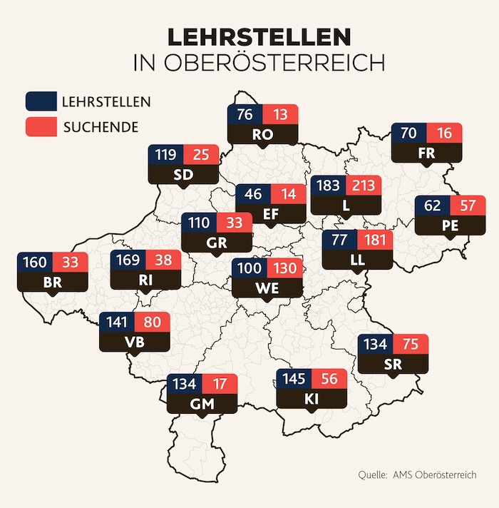Besonders eklatant ist die Differenz im Innviertel: In Braunau kommen auf 33 Lehrstellensuchende 160 offene Stellen, in Schärding gibt es 119 Plätze, aber nur 25 Suchende. Einzig in den Ballungsräumen um Linz und Wels gibt es mehr Bewerber als Lehrstellen, wie Daten des AMS OÖ zeigen – siehe Grafik unten.