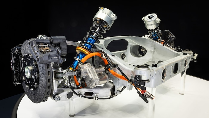 Das Herzstück des Elettrica sind insgesamt vier Elektromotoren, je zwei pro Achse, alles Eigenentwicklungen aus Maranello. Die vordere Achse liefert 210 kW und 3500 Nm an die Räder, die hintere wuchtet 620 kW und 8000 Nm auf den Asphalt. Die Permanentmagnet-Synchronmotoren drehen bis zu 30.000/min.