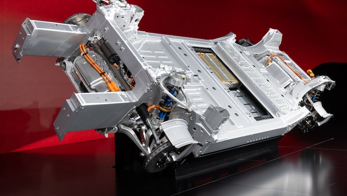 Der Schwerpunkt liegt acht Zentimeter tiefer als bei einem vergleichbaren Verbrenner. Ganze 75 Prozent von Chassis und Body bestehen aus recyceltem Aluminium, was pro Auto 6,7 Tonnen CO₂ spart.