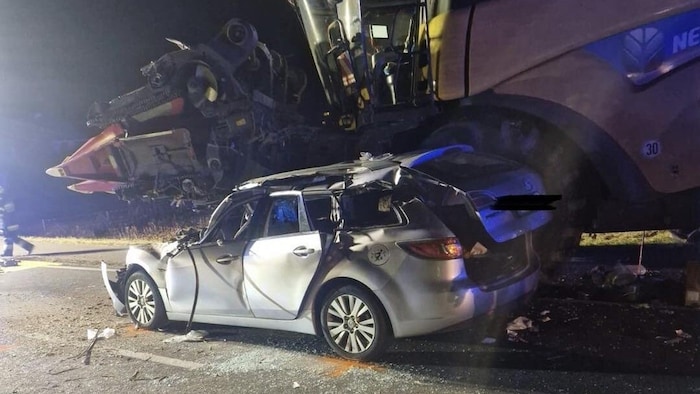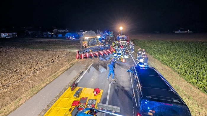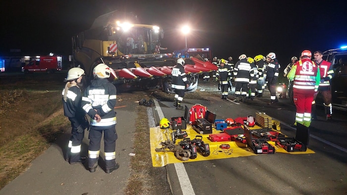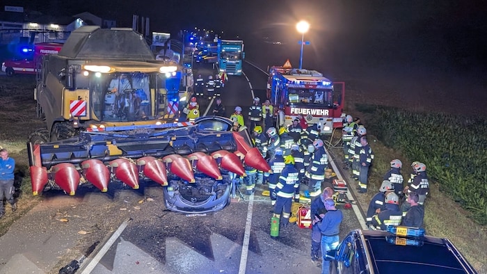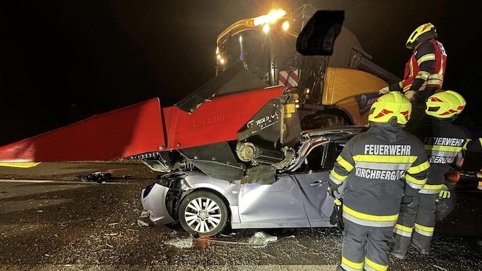 Der Unfall ereignete sich kurz vor 22 Uhr auf der L201 in Berndorf. Ein 30-jähriger Einheimischer war mit Beifahrer von Feldbach Richtung Kirchberg unterwegs und übersah offenbar einen Mähdrescher in einem angrenzenden Feld. Dessen Lenker wollte mit dem Schwerfahrzeug die Landesstraße queren.