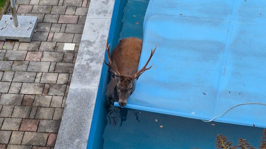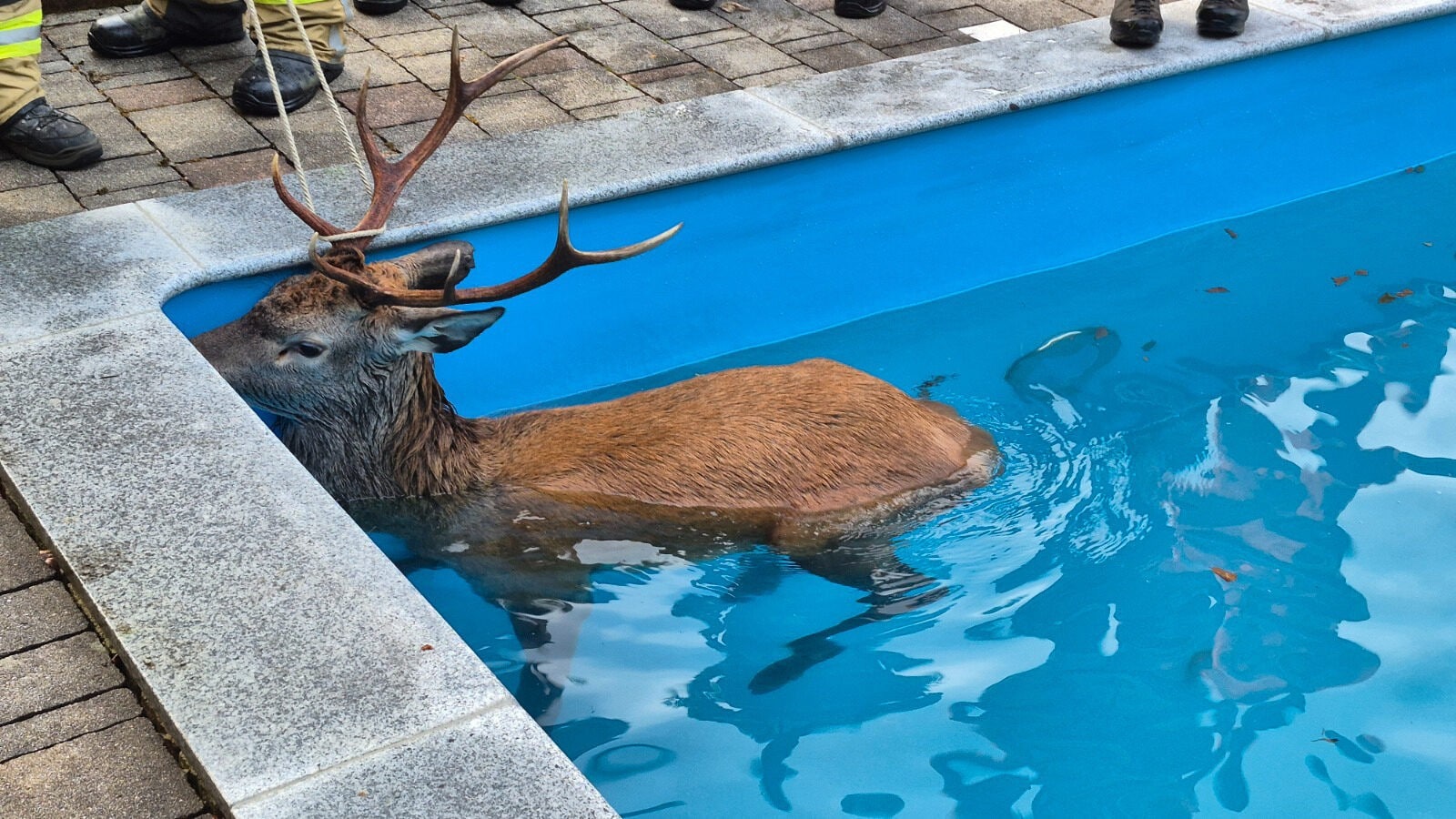Die Frau hatte bereits in der Nacht ungewöhnliche Geräusche in ihrem Garten gehört. Sie ging aber offenbar davon aus, dass es nur ein Marder oder ein ähnliches Tier war. In der Früh dürfte sie dann aber ihren eigenen Augen nicht getraut haben. Ein rund 120 Kilogramm schwerer, etwa drei Jahre alter Hirsch war in ihren etwa 1,20 Meter hoch gefüllten Swimmingpool geraten und konnte sich nicht mehr selbst befreien.
