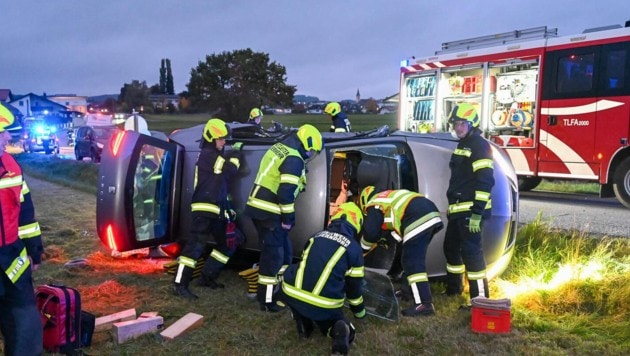 Der Pkw kam im Straßengraben zum Liegen, die Lenkerin wurde im Fahrzeug eingeschlossen und konnte dieses nicht mehr selbstständig verlassen. Mittels technischer Rettungsmaßnahmen wurde sie von Feuerwehrleuten befreit und dem Rettungsdienst übergeben.