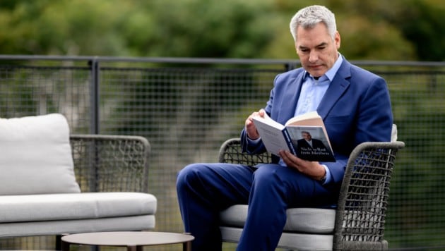 Im ältesten Stahlbetongebäude von Wien, den ehemaligen denkmalgeschützten Tribünen der Trabrennbahn Krieau, residiert nach 60 Jahren Leerstand das „Red Bull Mediahaus“. Im vierten Stock ist ein Besprechungszimmer mit Terrasse reserviert, auf dem runden Glastisch liegt das druckfrische Buch mit dem Titel „Sich selbst treu bleiben“ (EcoWing Verlag). Autor ist der ehemalige Bundeskanzler Karl Nehammer, der nebenan in der Maske sitzt – neben dem „Krone“-Sonntagsinterview sind an diesem Freitagnachmittag noch zwei Fernsehauftritte eingetaktet. „Ich mag diese Kombination aus Holz und Glas“, sagt er später bei unserem Gespräch, „hier entstand auch mein Buch.“ Vor ihm liegen fünf große „Krone“-Interviews, in denen es um Corona, Zäune, „rotes Gsindl“ und seinen Besuch bei Wladimir Putin ging.