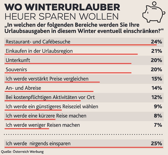 Der Winterurlaub bleibt daher, trotz Verteuerungen etwa bei den Liftkarten oder den Unterkünften, hoch im Kurs. Nach 49 Prozent in der Saison 2024/25 planen heuer sogar 54 Prozent der Österreicher einen solchen. Insgesamt überlegen 20,8 Millionen Gäste (+0,9 Prozent) aus dem In- und Ausland zu uns zu kommen. „Der Trend geht dabei zu 4- und 5-Stern und zu Apartments. 2- und 3-Stern geraten unter Druck“, betont Susanne Kraus-Winkler, Ex-Tourismusstaatssekretärin und Obfrau der Bundessparte Tourismus- und Freizeitwirtschaft in der Wirtschaftskammer (WKÖ). Das zeigt auch die Umfrage, denn jeder Fünfte spart bei der Unterkunft (siehe Grafik). Gleichzeitig schränken sich 25 Prozent der Reisenden überhaupt nicht ein.