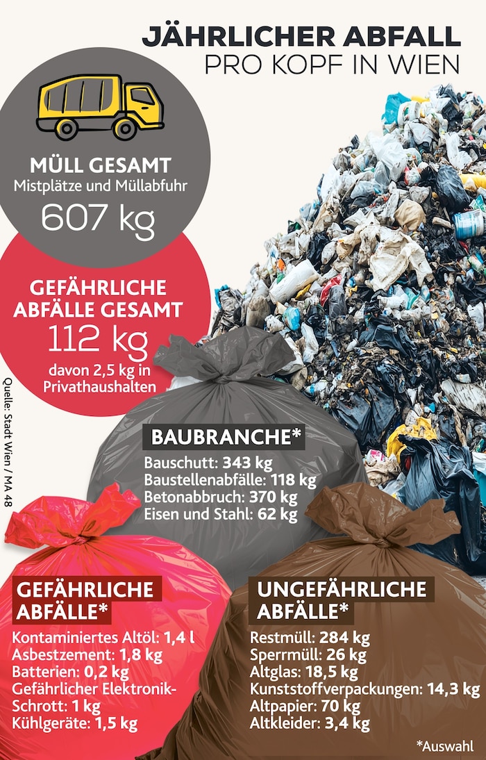Den Mist hinauszubringen – und idealerweise davor zu trennen – verschafft ein Trugbild von den Müllmengen, die in Wien jeden Tag anfallen: Ein genauer Blick in die Zahlen der Abfallwirtschaft zeigt etwa: Jeder Wiener hinterlässt in seinem Haushalt jährlich 2,5 Kilo gefährliche Abfälle. Insgesamt ist die Menge in dieser Kategorie – außerhalb des Haushaltes (Stichwort Ölwechsel beim Auto & Co.) – mit statistischen 112 Kilo pro Kopf fast 50 Mal so hoch.