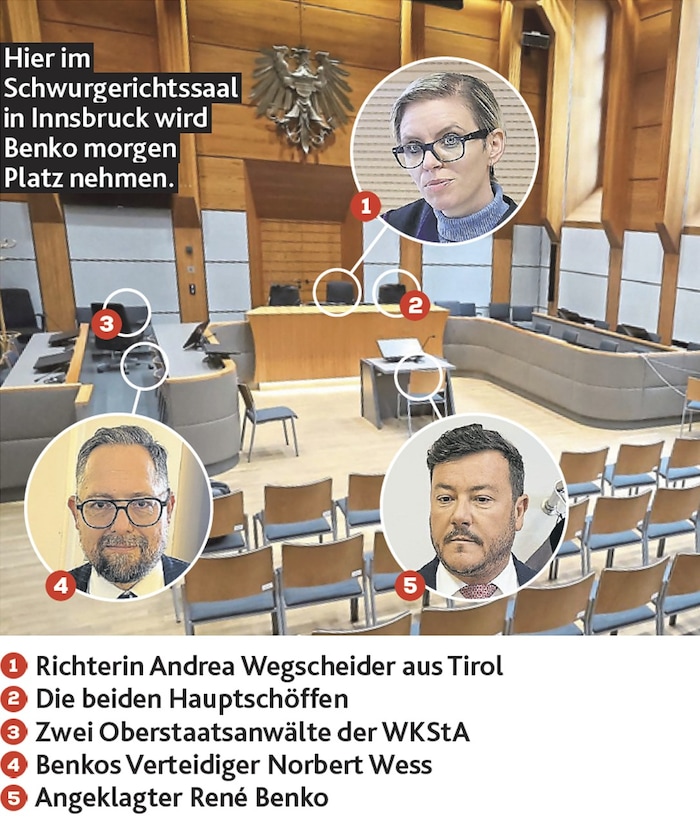 Über Schuld oder Unschuld des angeklagten René Benko wird ein Schöffensenat entscheiden. Das heißt, auch zwei Laienrichter urteilen mit. Ebenfalls vorne platziert: Ersatzschöffen und eine Schriftführerin. Prozessstart ist am Dienstag um 9 Uhr. Da sollen die Plädoyers und die Befragung Benkos stattfinden. Am Mittwoch sind acht Zeugen geladen. Eventuell fällt da auch schon ein Urteil. Falls nicht, ist der Schwurgerichtssaal im Landesgericht Innsbruck kommende Woche am Montag, Dienstag und Mittwoch für Ersatztermine reserviert.