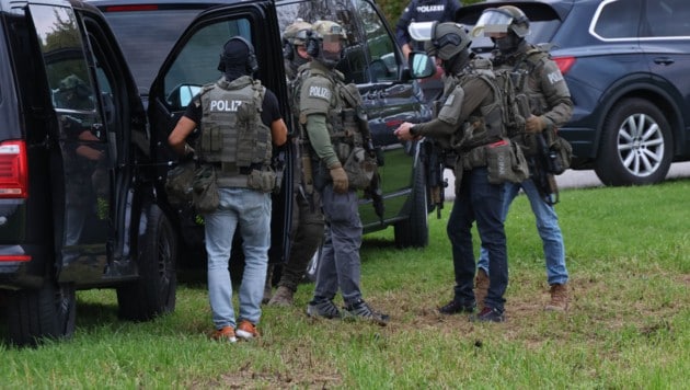 Ein Großaufgebot an Polizisten – Cobra, Schnelle Interventionsgruppe, Streifenbesatzungen, sprengstoffkundiges Organ, Waffenmeister, Hundeführer und Helikoptercrews – stand am Samstag im Einsatz, nachdem ein Zeuge gemeldet hatte, dass bei dem Bauernhof mehrere Personen mit Sturmgewehren hantiert haben sollen.