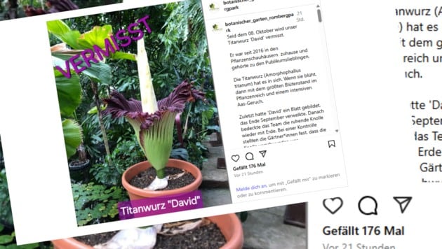„Der Diebstahl von ,David‘ trifft uns und wir hoffen, dass die Diebe ihre Entscheidung bereuen und ,David‘ zurückbringen – damit er wieder für alle Besucherinnen und Besucher blühen kann“, so der Botanische Garten Rombergpark auf Instagram.