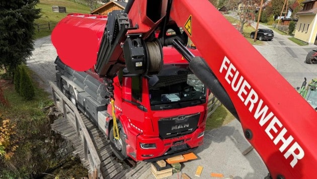 Die Einsatzkräfte der Feuerwehr St. Andrä riefen zur Unterstützung das schwere Rüstfahrzeug der Feuerwehr Tamsweg hinzu. Mithilfe von Hebekissen und Kran konnte die Vorderachse des Lkw vorsichtig angehoben und die Brücke unterbaut werden. So konnte das Fahrzeug schließlich eigenständig aus der misslichen Lage herausfahren.