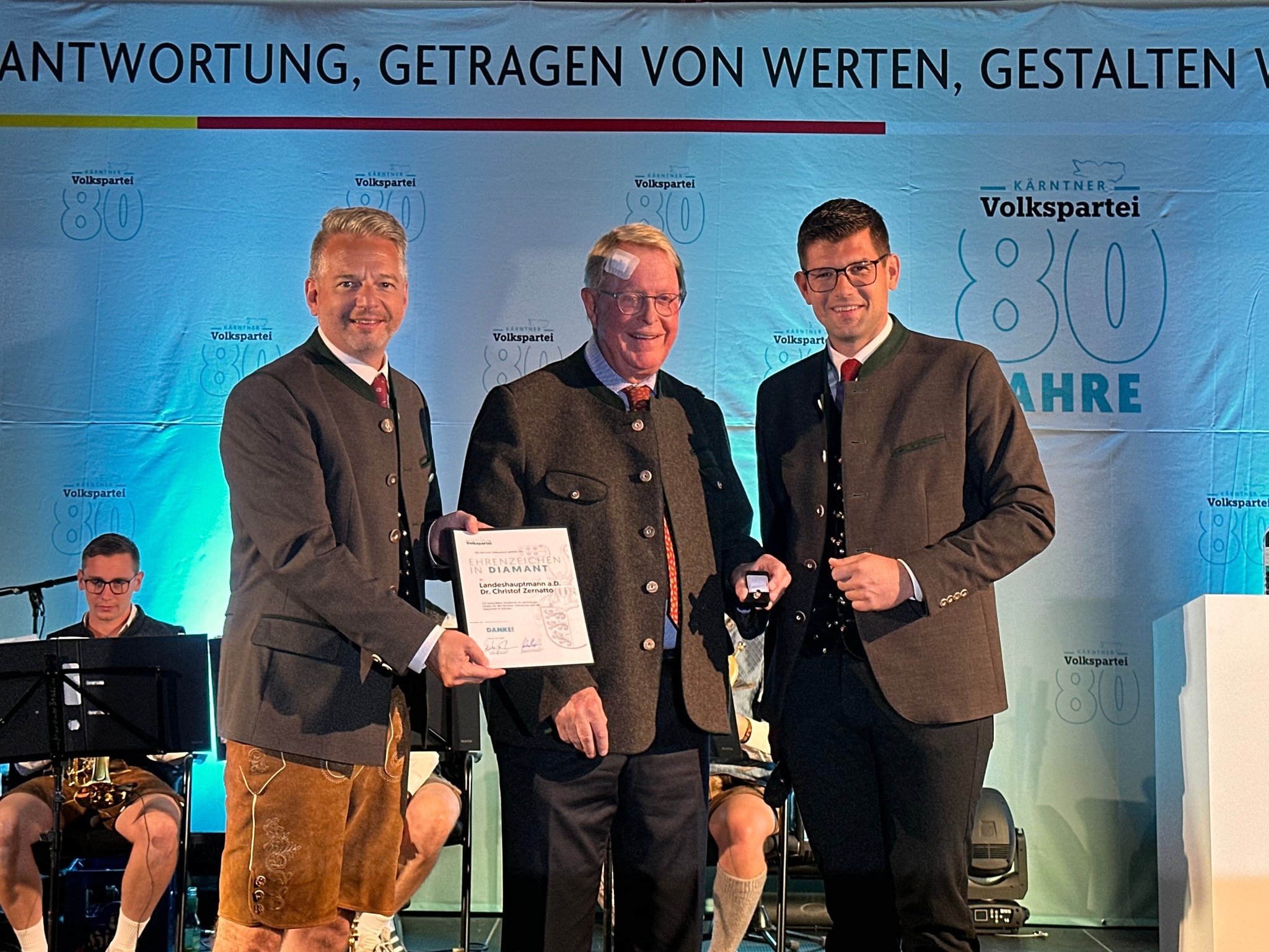Man müsse das Vertrauen zurückgewinnen: „Parteien waren einst das Bindeglied zwischen Bürger und Staat, heute glauben die Menschen, die Politik dient nur sich und einer kleinen elitären Gruppe“, so Zernatto. „Wir müssen auf die Menschen zugehen und uns als Kümmerer bewähren!“ Gerade durch Kaisers Rückzug würden die Karten neu gemischt werden: „Ich drücke dir die Daumen, Martin. Ich kann dir aus Erfahrung sagen: In der Politik ist alles möglich!“, schließt Zernatto, der von Martin Gruber im Anschluss die höchste Auszeichnung der ÖVP – das Ehrenzeichen in Diamant – überreicht bekommen hat, seine Rede.