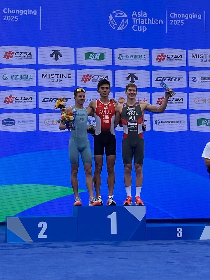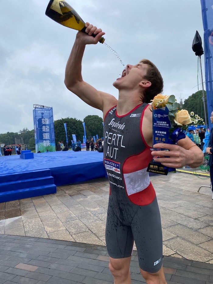 Der dritte Rang von Triathlet Lukas Pertl beim Asien-Cup in Chongqing (Chn) wurde gebührend gefeiert. „Podiumfeiern in China sind immer speziell, die machen immer ein großes Tamtam mit Feuerwerk. Es macht immer Spaß, wenn man dort am Podest sein darf“, freute sich der 30-Jährige, der bis zum Schluss um den Sieg mitkämpfte, sich dann aber einem Chinesen und einem Russen geschlagen geben musste. „Es war ein richtig guter Bewerb, ein ziemlich geiler Tag.“