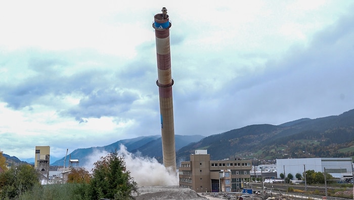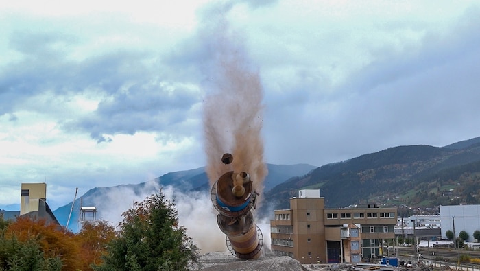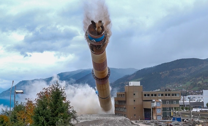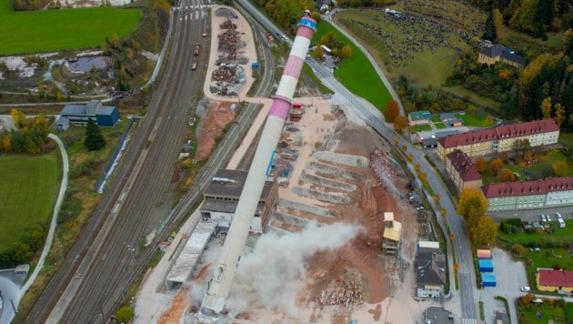 Der 144 Meter hohe Werksschlot „Langer Ernst“ liegt in Schutt und Asche: Am Samstag endete mit der Sprengung auch ein Kapitel Industriegeschichte im Paltental (Steiermark). Mehr als 2000 Schaulustige waren vor Ort.