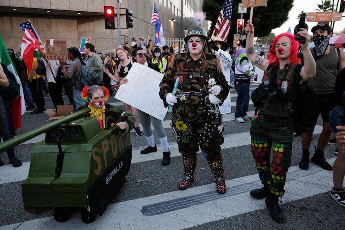 Auch im wohlhabenden Umland der Hauptstadt versammelten sich zahlreiche Demonstrierende. In Bethesda im Bundesstaat Maryland standen sie mit Schildern, Wimpeln und Postern entlang der Connecticut Avenue. Autofahrer hupten zustimmend. Eine Frau in einem Hahnenkostüm hielt ein Schild mit der Aufschrift „Wir brauchen keine royalen Dekrete“ – wohl als Anspielung auf die zahlreichen Anordnungen, mit denen Trump seine Politik durchsetzen will.