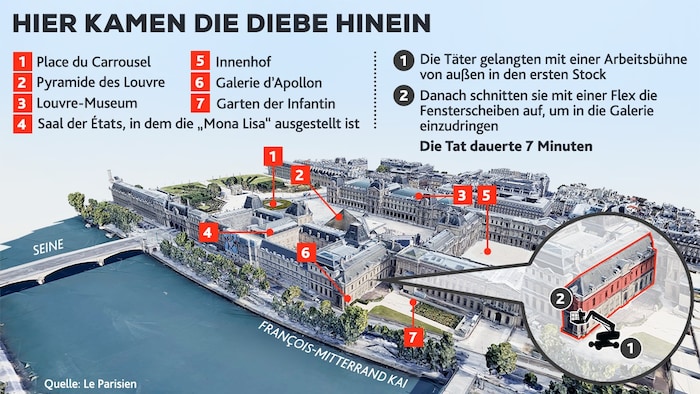 Wie die Zeitung „Le Parisien“ berichtete, waren die vollständig vermummten Täter über eine Gebäudeseite an dem Fluss Seine eingedrungen. Dort werden gerade Bauarbeiten durchgeführt. Um direkt in den gewünschten Ausstellungsraum in der Galerie d‘Apollon zu gelangen, sollen sie einen Lastenaufzug benutzt haben. Anschließend schnitten sie mit einer Flex die Fensterscheiben auf. Zwei Männer seien dann ins Innere des Louvre gedrungen, ein dritter habe Wache gehalten.