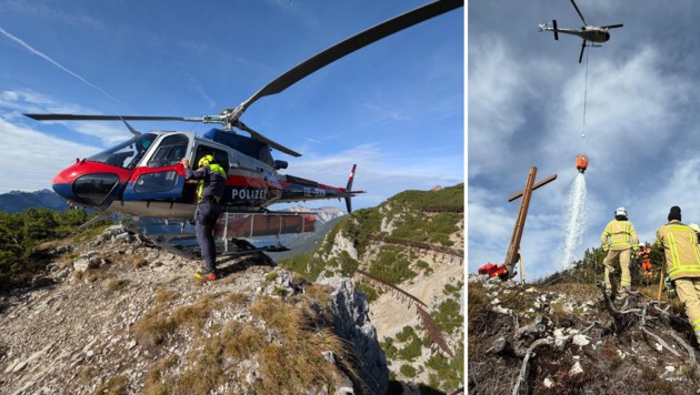 Mit dem Polizeihubschrauber wurden Feuerwehrkräfte zur Brandbekämpfung auf den Gipfel geflogen bzw. Löschflüge durchgeführt.