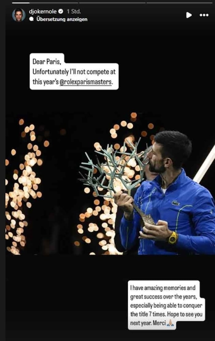 „Liebes Paris“, schreibt Djokovic in einer Insta-Story kurz und knapp: „Leider werde ich heuer am Masters nicht eilnehmen.“ Weiter unten entsinnt er sich dann der „großartigen Erinnerungen und großartigen Erfolge“, die er über die Jahre bei dem Turnier gesammelt hat. Immerhin: „Ich hoffe, wir sehen einander nächstes Jahr.“ Das ist ja zumindest eine Ansage – wenngleich eine wirkliche Begründung für die Absage 2025 fehlt.