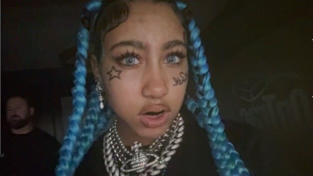 North West zeigt sich darin mit stahlblauen Zöpfen, Fake-Gesichtstattoos, Henna-Bemalung an Armen und Handrücken sowie einem Nasenring. Dazu sind ihre Vorderzähne mit schwarzen Grills (Zahnschmuck) verziert, und sie trägt blaue Farb-Kontaktlinsen.