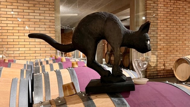 Abseits des Dialogs standen Stippvisiten in der Ried Himmelreich in Donnerskirchen, im Weingut Leberl und bei Spitzenwinzer Andi Kollwentz an. Letzterer sorgte mit einem traditionellen Symbol für positive Stimmung: einer schwarzen Katze auf jenem Holzfass, in dem der beste Wein heranreift.