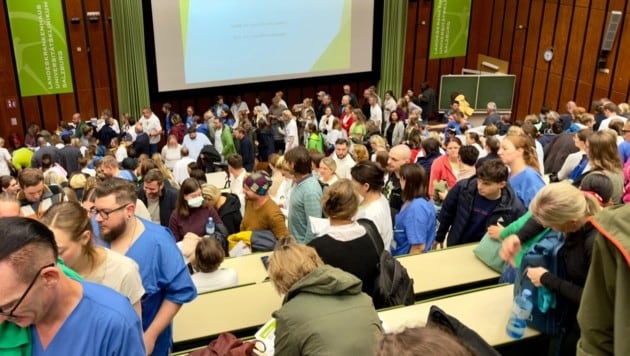 Der Hörsaal im Salzburger Landesklinikum gleicht einer Sauna. Auf den Treppen, gleich innerhalb der Türe: Bis auf den letzten Zentimeter ist der Raum voll. Hunderte Betroffene sind sauer.