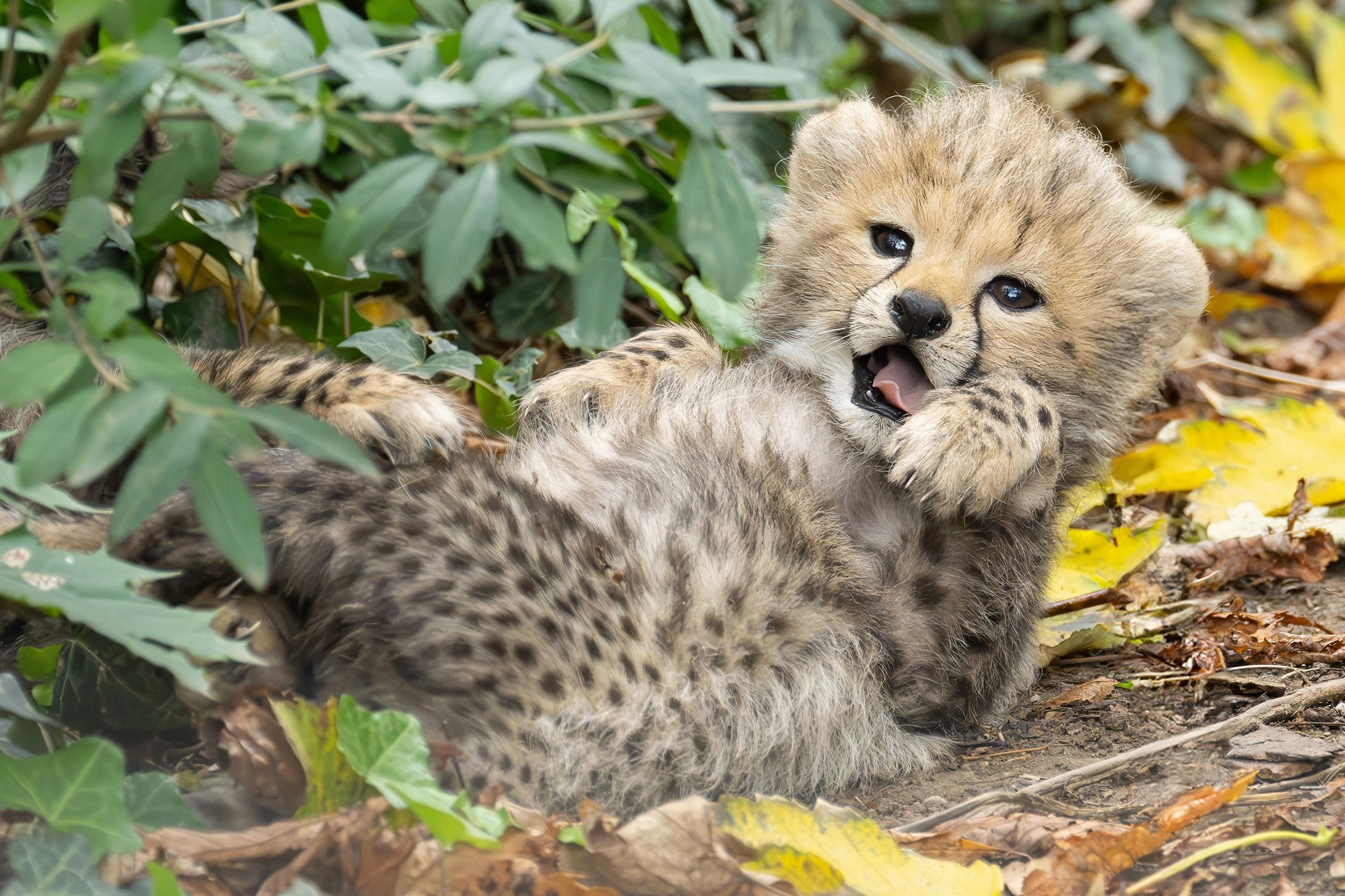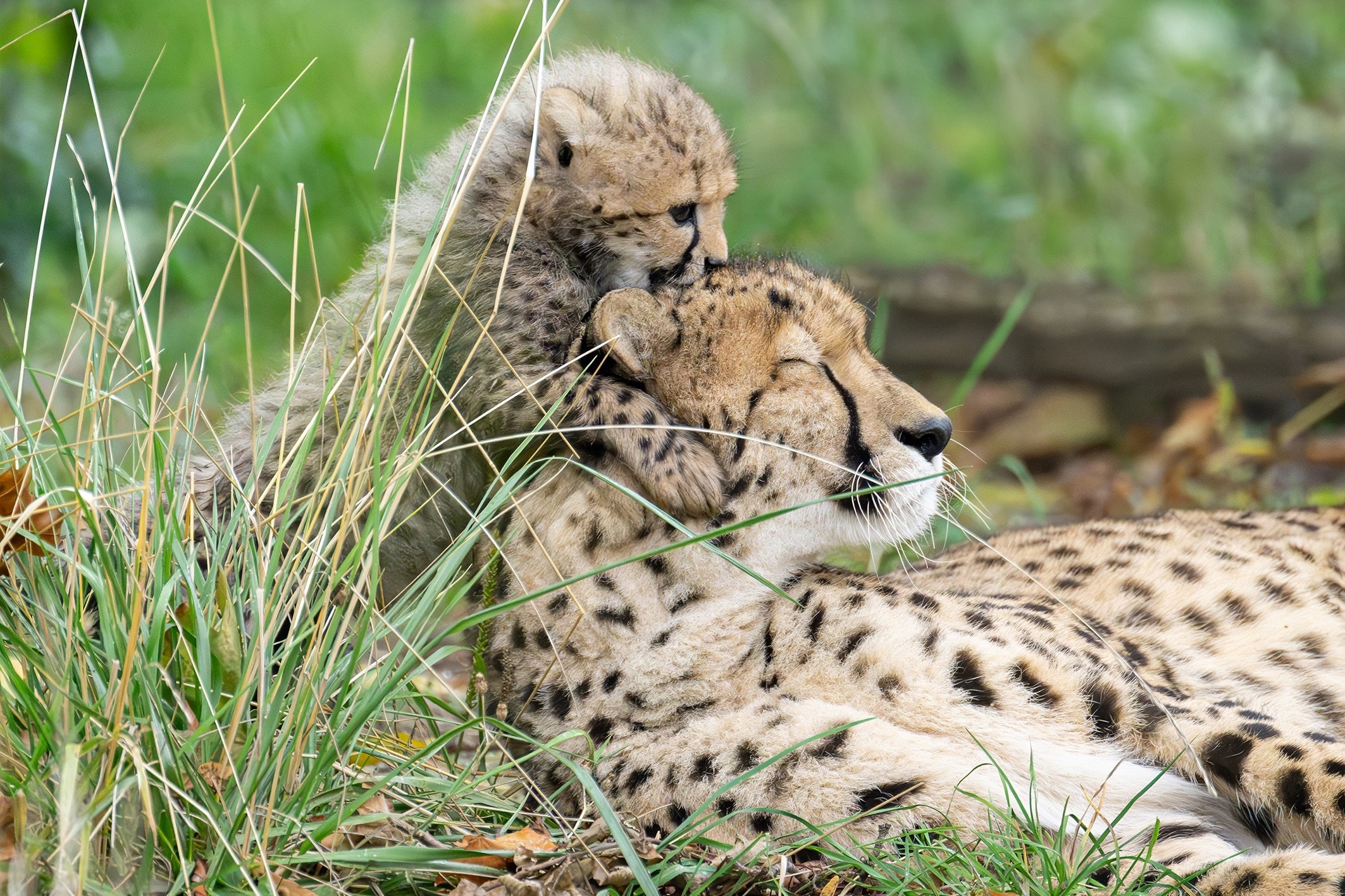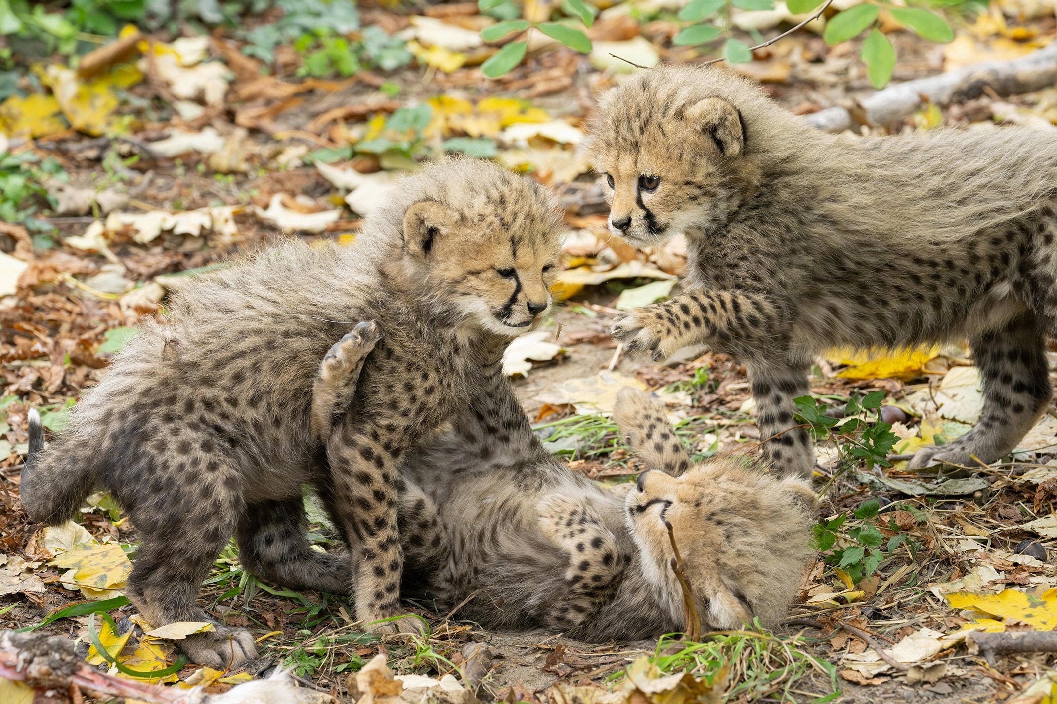 In der Wildbahn sind Gepardenjunge leichte Beute für viele Raubtiere. Nur wenige erreichen das Erwachsenenalter. Auch im Tiergarten bleibt das Muttertier laut Eder stets wachsam. „Wer genau hinhört, kann viele Laute vernehmen. Das Weibchen ruft seine Jungen, wenn sie sich zu weit entfernen, und die Kleinen melden sich, wenn sie sich kurz unsicher fühlen.“ Müde von ihren Abenteuern kuscheln sich die Jungtiere an das Muttertier und werden fürsorglich abgeleckt.