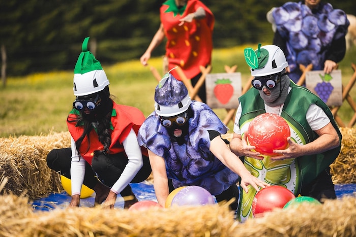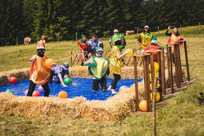 Dann folgt das erste Spiel – und das hat's in sich: „Ein ausgesprochen prominenter Obstsalat“. Eine wilde Mischung aus Ballwerfen und Promi-Zitate-Raten, bei der die Kandidaten erraten müssen, welche bekannten Persönlichkeiten die Sprüche gedroppt haben.