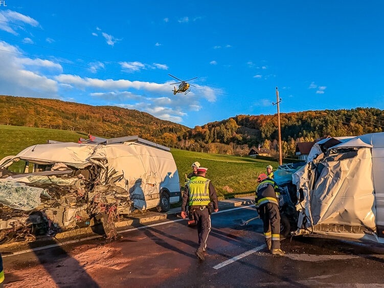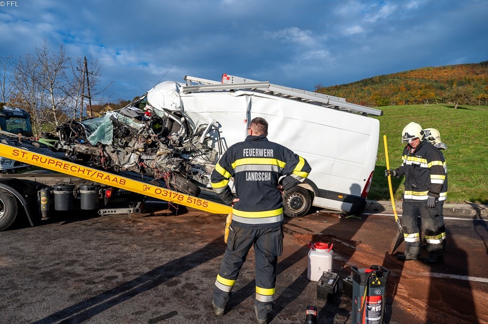 Heftige Bilder postete die Freiwillige Feuerwehr Landscha von ihrem Einsatz am Samstagmorgen auf der B72 (Weizer Straße): Kurz nach 7 Uhr kollidierten hier zwei Kastenwägen – das E-Call-System alarmierte die Einsatzkräfte. Der Lenker des einen Fahrzeugs, ein 21-jähriger Syrer aus Graz, konnte sich noch selbst aus dem Auto befreien. Er wurde leicht verletzt.