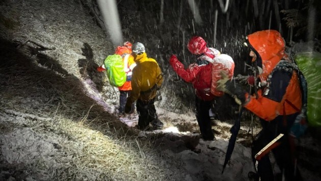 Zehn Bergretter steigen bei widrigen Bedingungen auf den Berg, versorgten die drei Männer mit trockener Kleidung und Wärmepads, ehe sie diese sicher ins Tal brachten. Die Sportler waren beim Eintreffen der Rettungskräfte völlig durchnässt, unterkühlt und erschöpft.