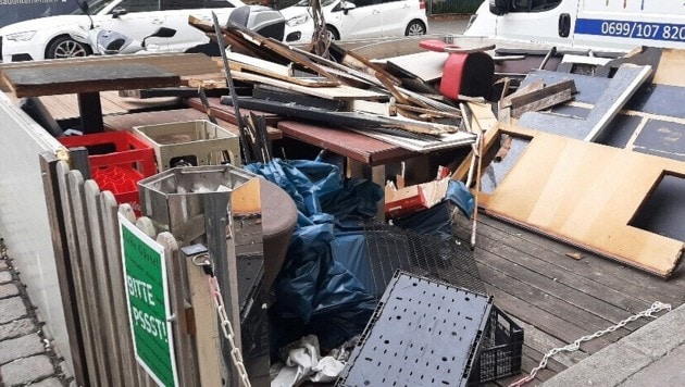 Seit Wochen blockiert Sperrmüll mehrere Parkplätze in der Wiener Brigittenau. Eigentlich steht dort ein Schanigarten, doch der wird nicht für die Gästebewirtung genutzt.