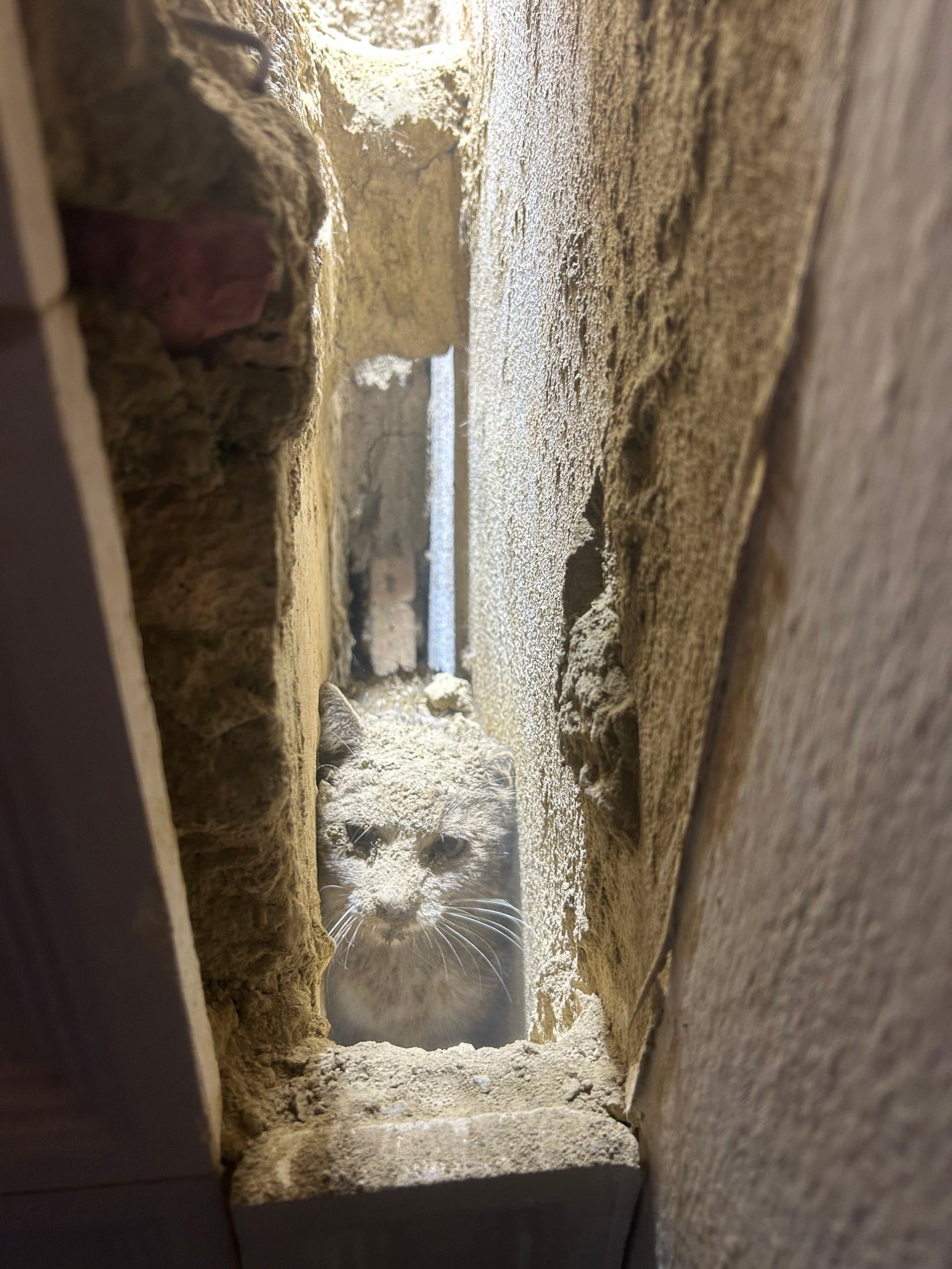 Am Donnerstag blieb die Katze „Crazy“ bei ihrem Zuhause in Fürstenfeld in einem Spalt zwischen Mauer und Kachelofen stecken. Die Feuerwehrkräfte befreiten sie, indem sie Kacheln von der Wand abschlugen.