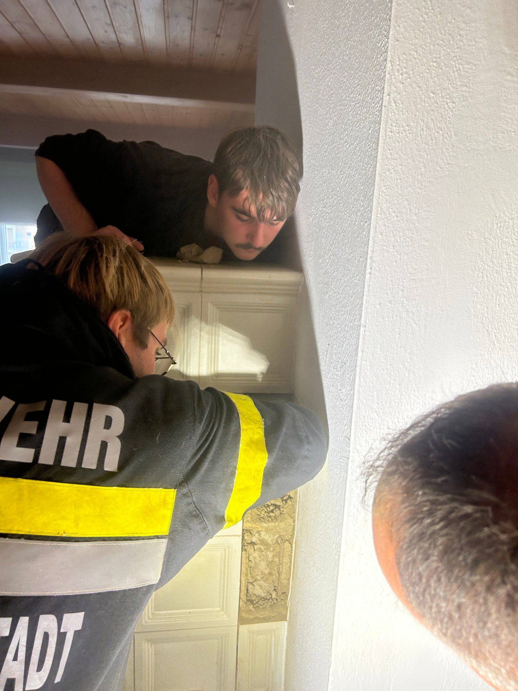 Zuerst versuchten es die Florianis mit Spülmittel, doch die Katze bewegte sich keinen Zentimeter. Auch mit den Armen war sie nicht zu fassen. Also griffen die Helfer zu Hammer und Meißel, um Kacheln von der Wand zu lösen. So konnten sie das Tier bergen und den erleichterten Besitzern übergeben. Zur Überprüfung ging es anschließend noch zum Tierarzt.