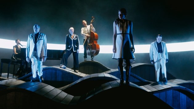 Geboten wird ein Zwitter aus Séance und Sprech-Oratorium. Fünf Schauspieler klettern auf einer Wellenlandschaft aus Schiffsplanken (Bild: Benjamin Schönecker). Sie sind in geometrisch blickdichte Einheitskleidung eingeschlossen, die sie während der 100 Minuten nicht wechseln. Nur die beklagenswerte Katharina Pichler wappnet sich als Protagonistin der nackten Orgie in der Wiener Vorstadtvilla noch mit einer überbreiten Jogginghose.