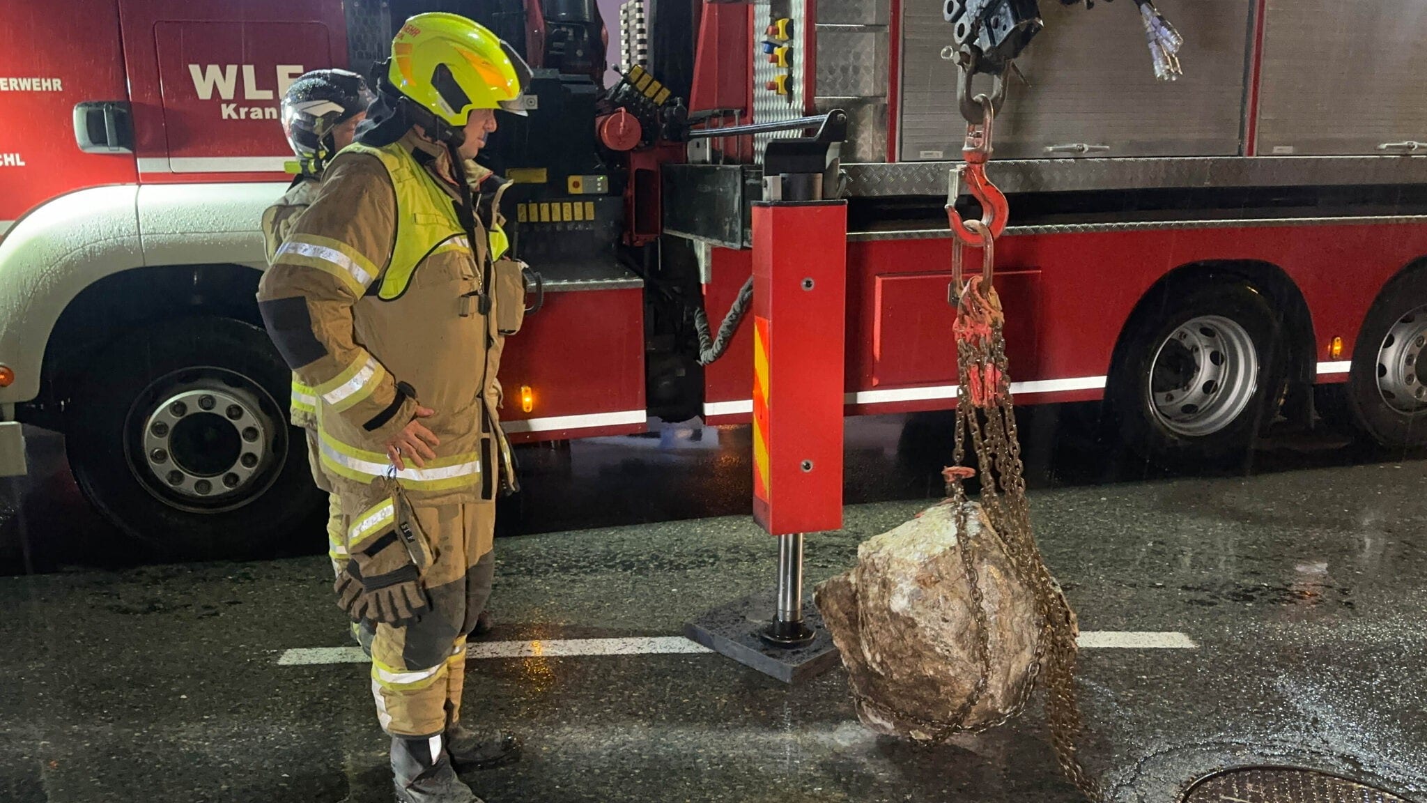 Dieser war offenbar zuvor vom sogenannten „Grattenbergl“ abgebrochen und direkt auf die Fahrbahn gedonnert, wie die Polizei berichtet. „Der Pkw kam mitsamt dem Felsbrocken, der mitgeschleift wurde, erst nach etwa 40 Metern zum Stillstand“, so die Ermittler weiter.