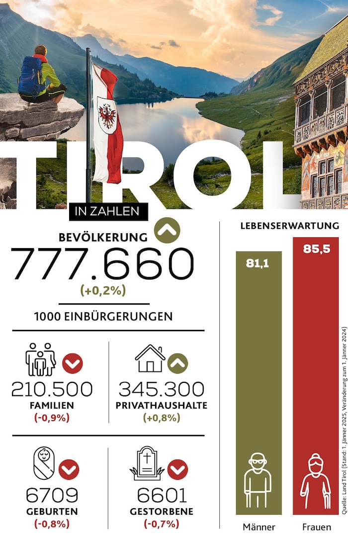 Interessant – und auch immer wieder ein politisches Thema – sind zudem die Fakten zu den Ausländern bzw. zu den Einbürgerungen. Von den 777.660 Personen, die zu Jahresbeginn in Tirol lebten, waren genau 147.825 Ausländer. Gegenüber dem 1. Jänner 2024 ist das ein Plus von 1,9 Prozent. Der Anteil der Ausländer gemessen an der gesamten Wohnbevölkerung beträgt 19 Prozent.