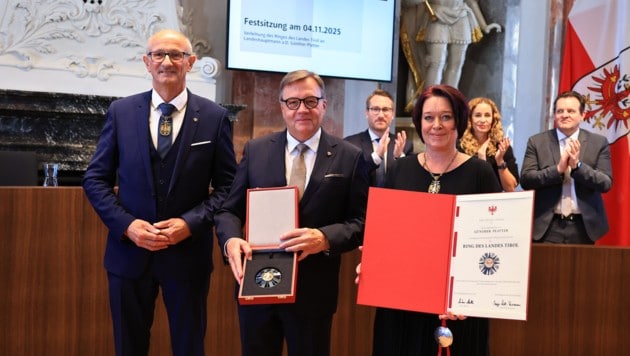 Der Ehrenring des Landes Tirol, die höchste Auszeichnung, die das Land zu bieten hat, wurde Günther Platter am Dienstag im Rahmen einer feierlichen Landtagssitzung von seinem Nachfolger und Parteikollegen Anton Mattle verliehen. Seine Zeit als Landeshauptmann bezeichnete Platter in seiner Dankesrede als „schönste Aufgabe“, er hatte sie von 2008 bis 2022 inne.