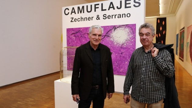 An der Ästhetik des Krieges arbeitet sich Zechner mit Camouflagen und Uniformen ab, die er etwa in seinen Schachtel-Collagen mit konkreter Poesie von Serrano kombiniert – ein paar der interessantesten Arbeiten dieser Schau. „Camouflagen sind ein Weg, sich zu schützen“, sagt Serrano. „Es gibt die Möglichkeit, zu überleben.“ Und Zechner ergänzt: „Wir haben versucht, schwere politische Tatsachen aufzugreifen und in eine Reibung zu geraten zwischen Literatur und Malerei.“