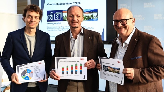 „Bitte lächeln!“, wird Bürgermeister Johannes Anzengruber (JA) für das Foto bei der gestrigen Pressekonferenz aufgefordert, dieser antwortet: „Bei dem Budget?!“ Es schüttelt einen nicht nur wegen der November-Temperaturen, sondern auch beim ersten Voranschlagsentwurf für Innsbrucks Budget 2026. Wie mehrfach berichtet, wird die Stadt den Gürtel enger schnallen müssen. Einzelne Projekte, die im Koalitionspapier stehen, wie etwa der Vorplatz des Hauses der Musik, werden daher erst einmal ausgesetzt.