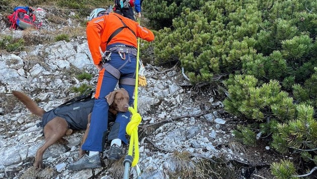 Die Bergretter seilten sich ab, sicherten den Vierbeiner in einem Hundegeschirr und führten ihn wieder auf den Steig. Der 36 Kilo schwere Labrador war unverletzt geblieben.