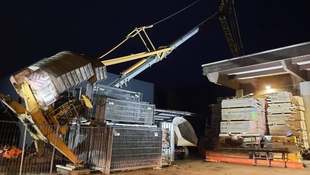 Gegen 17.15 Uhr machten sich die Arbeiter einer Baufirma daran, auf dem Betriebsareal mithilfe eines Krans einen rund 2200 Kilogramm schweren Container zu versetzen. Dieses Manöver ging allerdings in die Hose: Aus noch nicht näher geklärter Ursache kippte der Kran um – während der Container auf dem Vordach des Firmengebäudes liegen blieb, krachte der Ausleger des Krans auf die Gartenhütte eines benachbarten Wohnhauses und beschädigte diese schwer.
