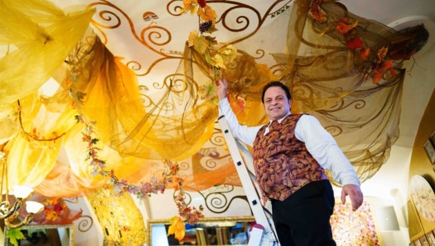 Im Schönbrunner Stöckl kümmert sich Matossian nicht nur um die Gäste, sondern auch um die Deko. Dafür kommt er um 4 Uhr früh ins Lokal. Im Keller hat er die Kisten nach Themen geordnet.